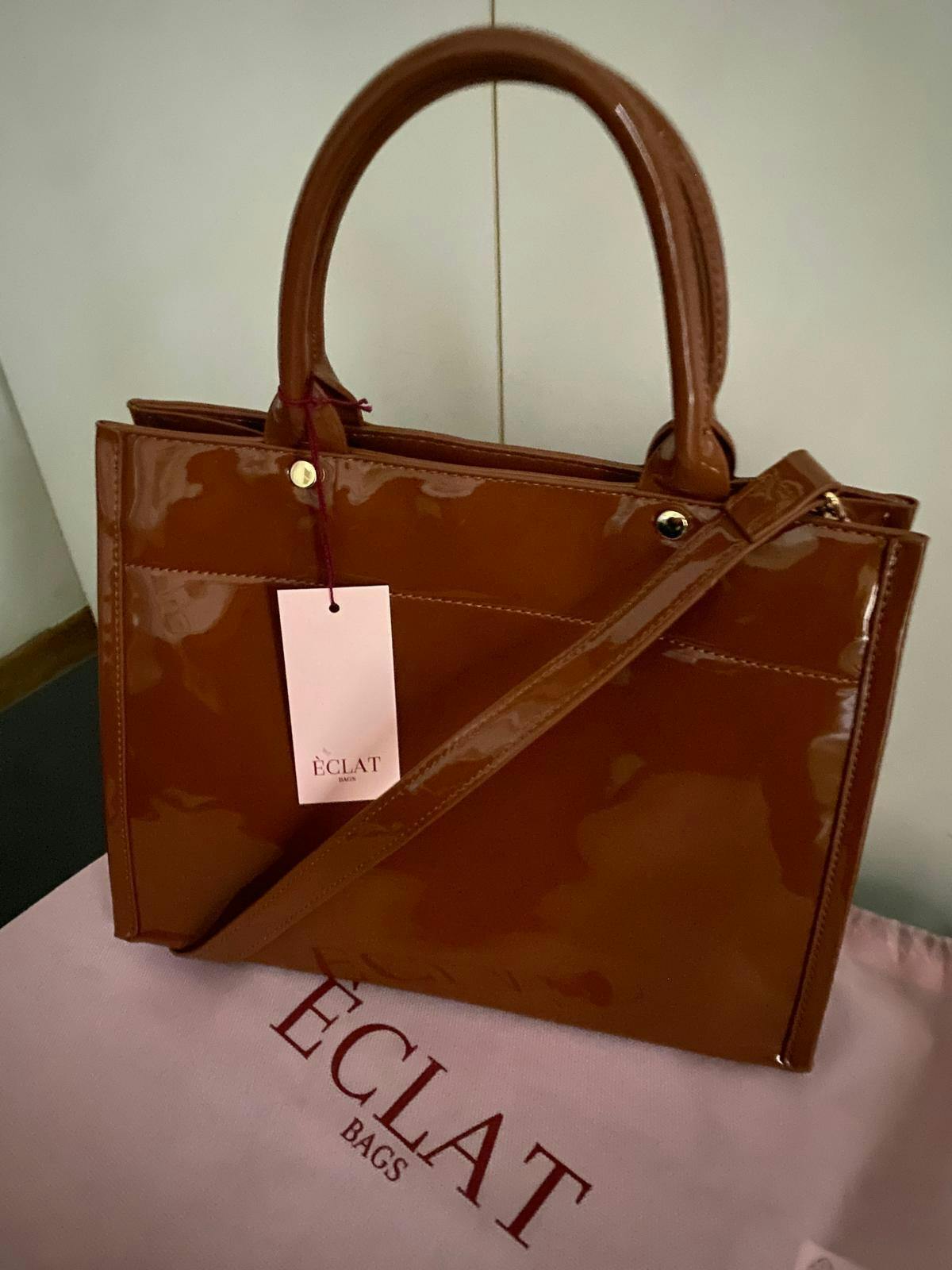 Adoro questa borsa! Il colore caramello è raffinato e la pelle vegana lucida le dà un tocco elegante. È versatilissima: perfetta sia con il tacco che con un look più casual.