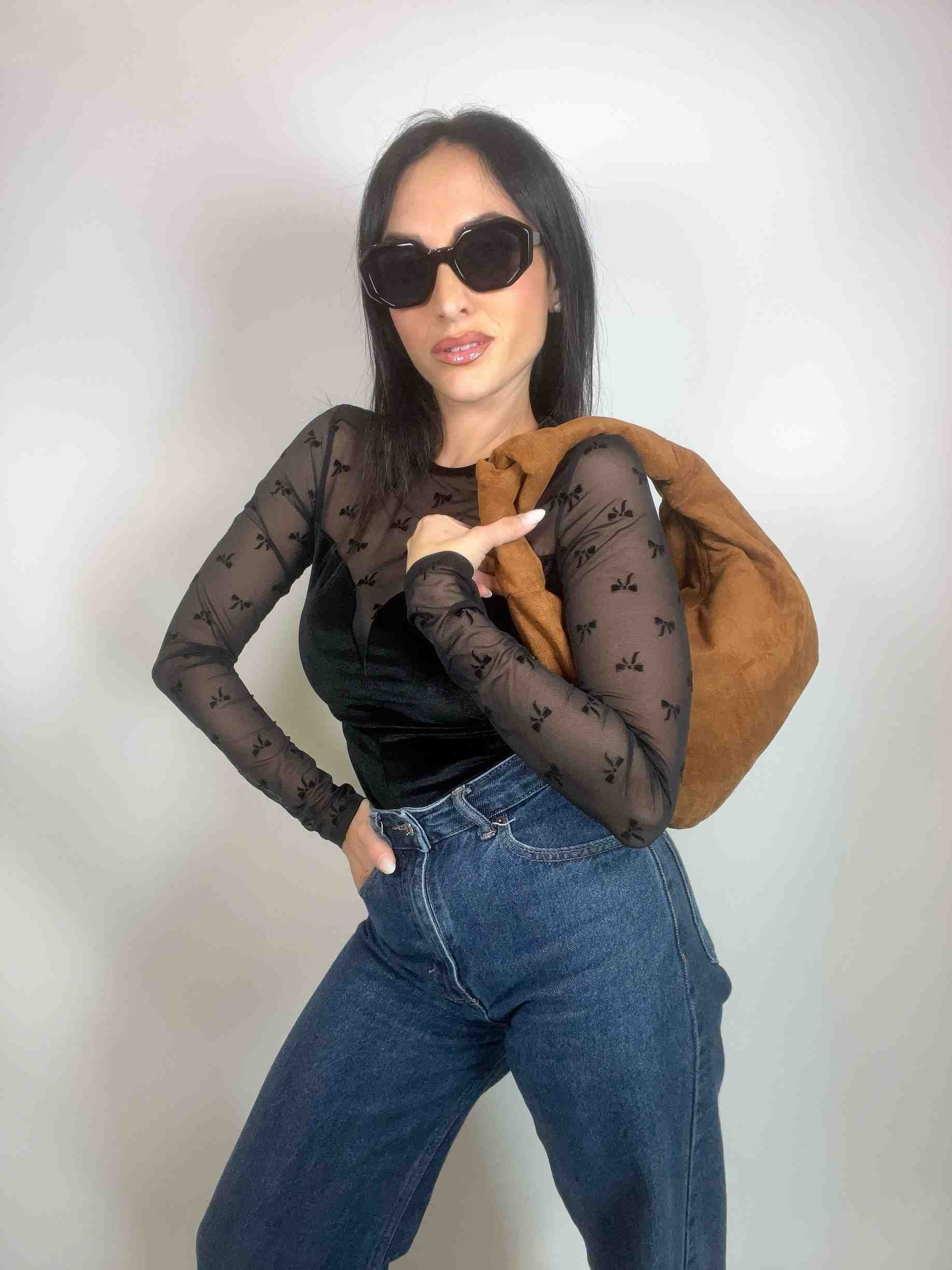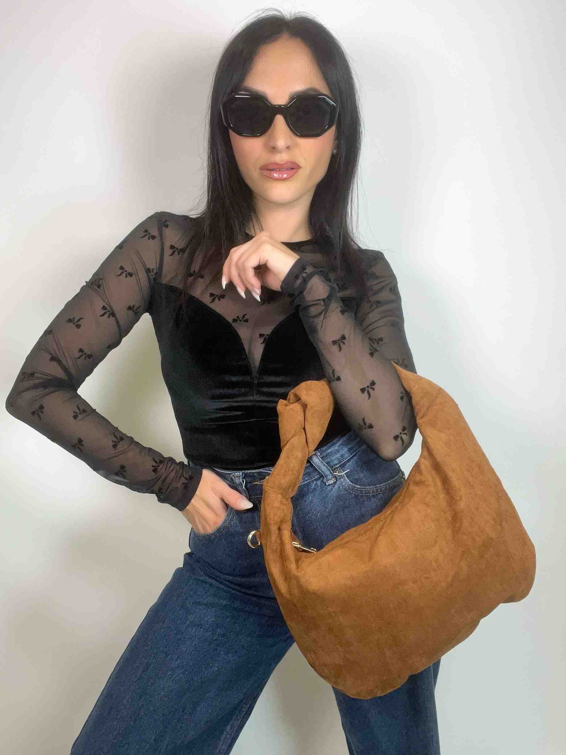 Realizzata in morbida ecopelle effetto suede, si distingue per la sua texture vellutata e il manico annodato che aggiunge un tocco ricercato ad ogni outfit.