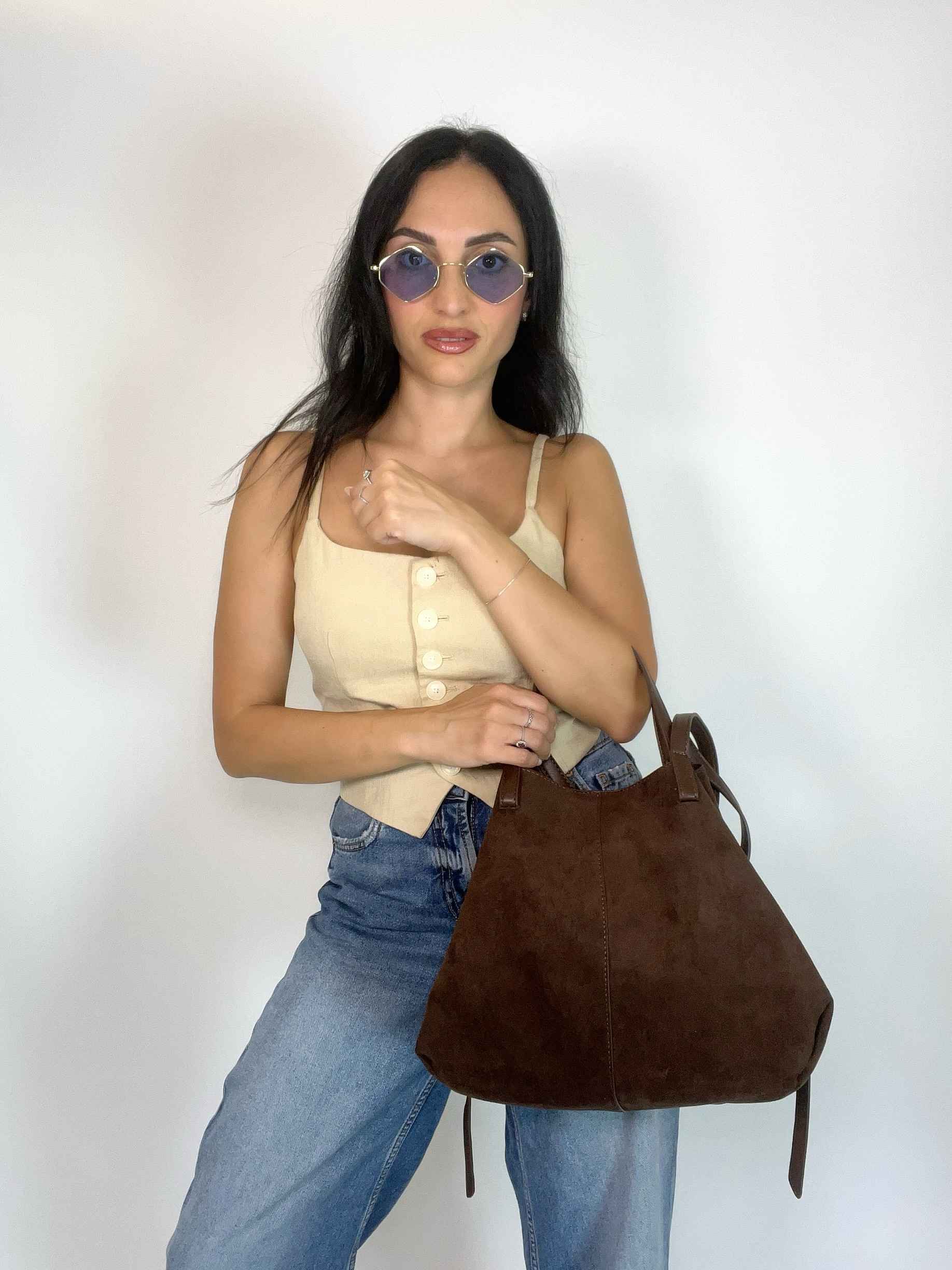 La borsa che unisce stile e funzionalità. Mia è realizzata in pelle vegana effetto camoscio, morbida e raffinata, pensata per chi cerca un accessorio elegante e cruelty free.